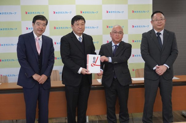 12月24日、米子ガス本社で行われた寄附贈呈式において、米子ガスグループ 米子ガス株式会社角田章代表取締役社長執行役員から本学に寄附金が贈られ、景山理事・副学長が寄附金の目録を受け取りました。